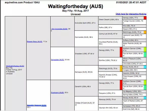 Waitingfortheday. An unraced 3YO filly, half sister to the speedy Fontiton. Bought for $420,000 and trained by Mick Price and Michael Kent Jnr.