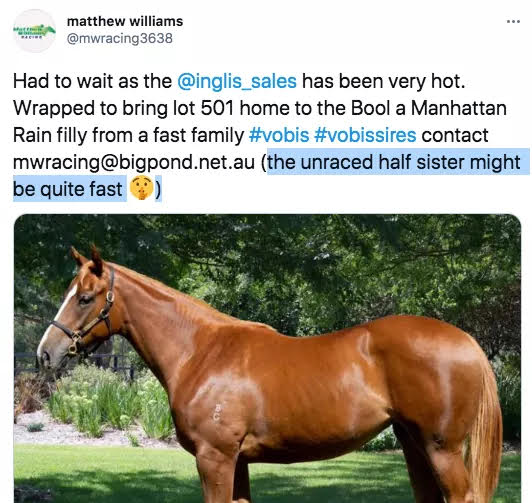 Close to a month ago, a fairly innocuous tweet popped up on my timeline from Warrnambool trainer Matthew Williams. It was smack bang during yearling sale season and like most trainers, he was trying to sell shares in recently acquired bloodstock. But something about it caught my attention,
